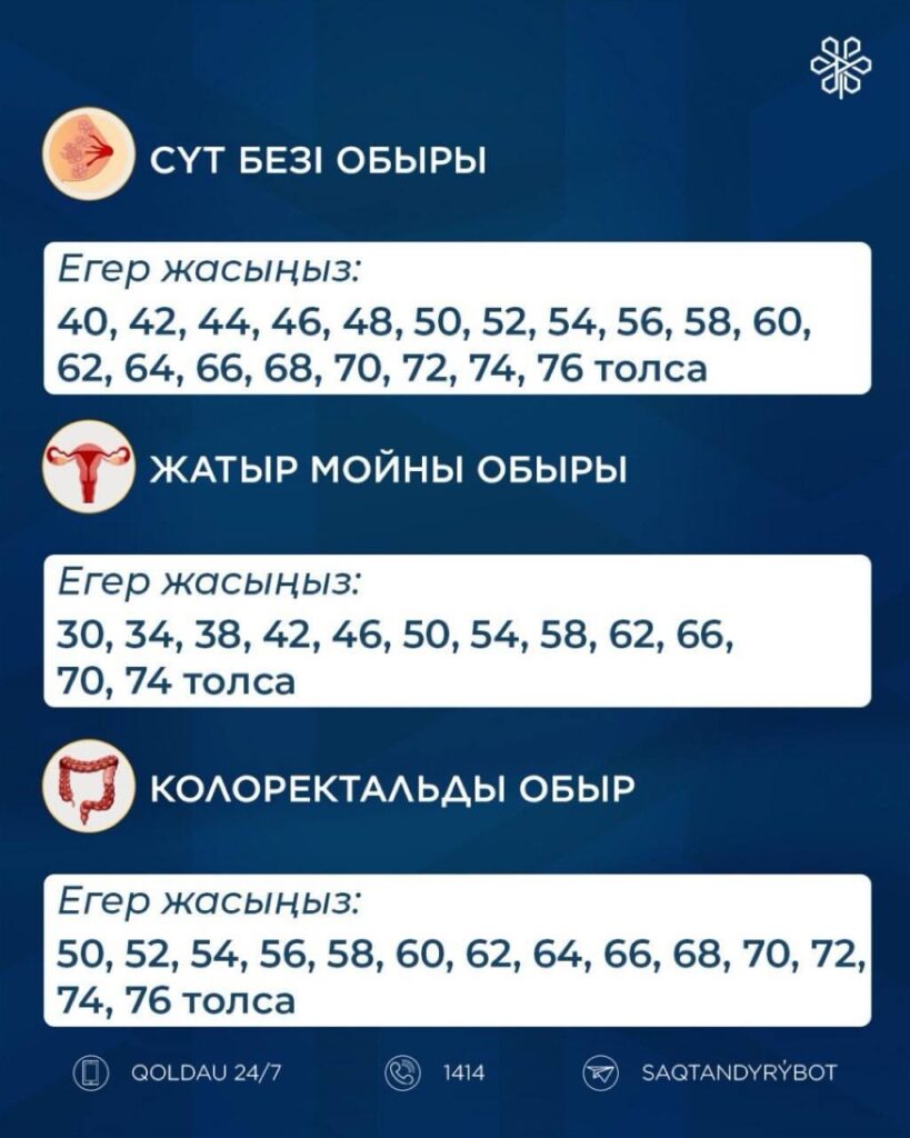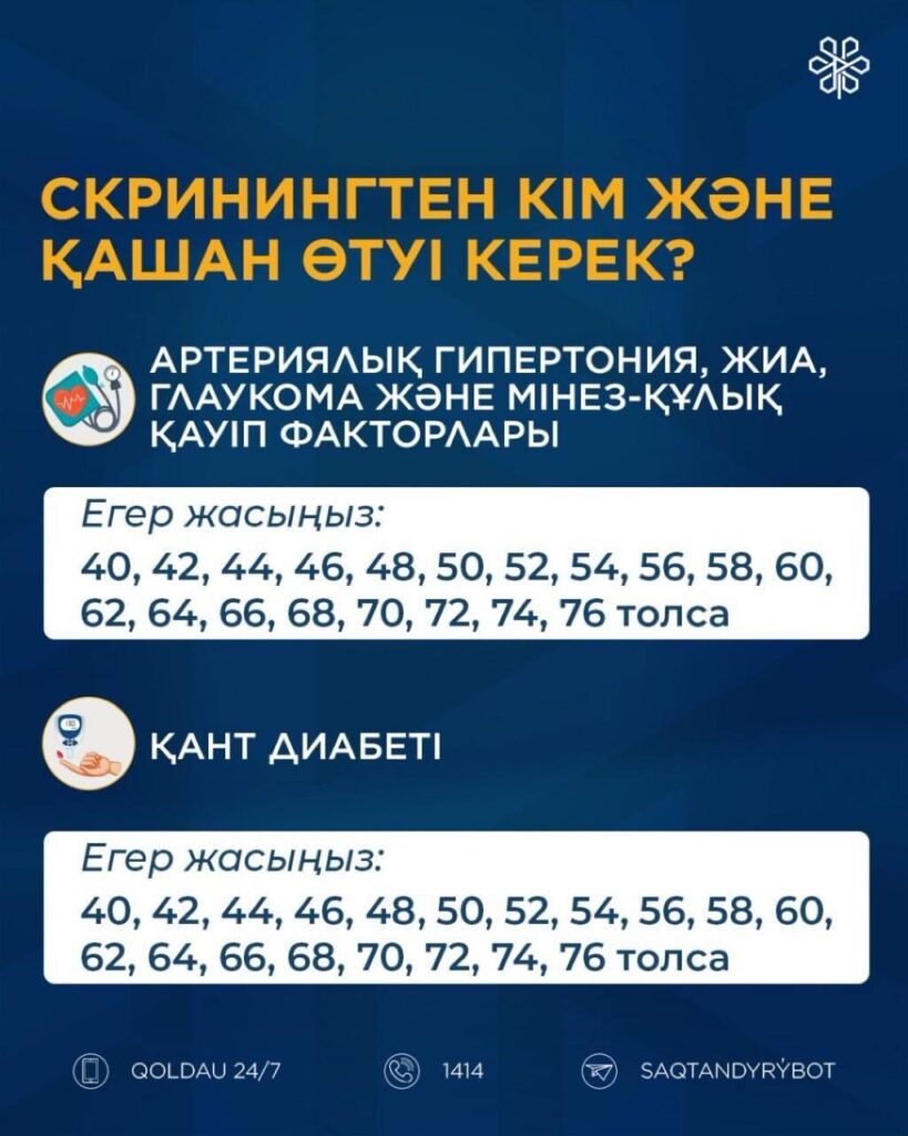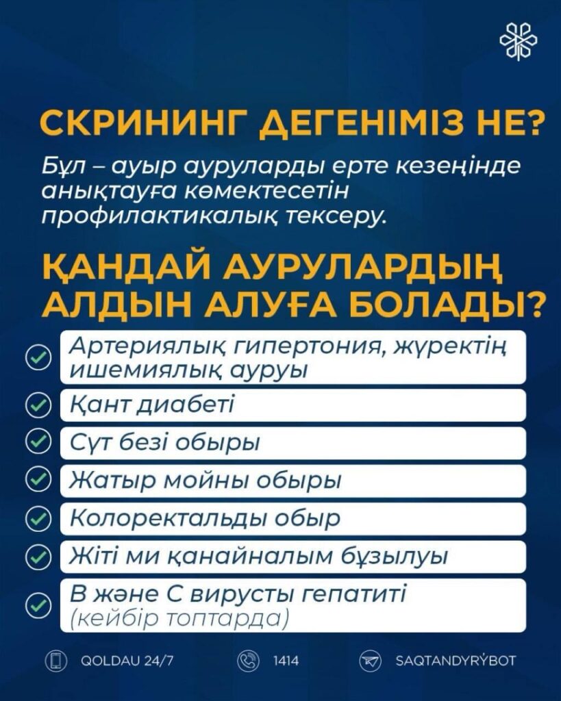 Қазақстанның әрбір азаматы денсаулығына ешқандай шағымы болмаса да, профилактикалық тексерулер мен скринингтерден уақтылы өтіп отыруы тиіс